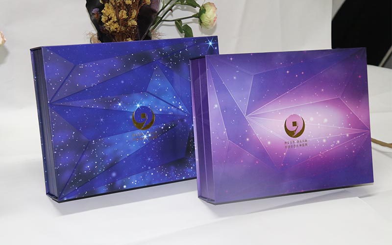 1.材質:盒子面紙採用157G銅版紙,表面彩色印刷,線條UV光油,LOGO文字燙金。裱1500G雙灰闆,盒子爲藍,紫兩個顔色,内托爲白色内盒裏面全部貼滿彩紙,盒型爲上下翻蓋盒磁鐵要有吸度。