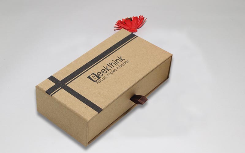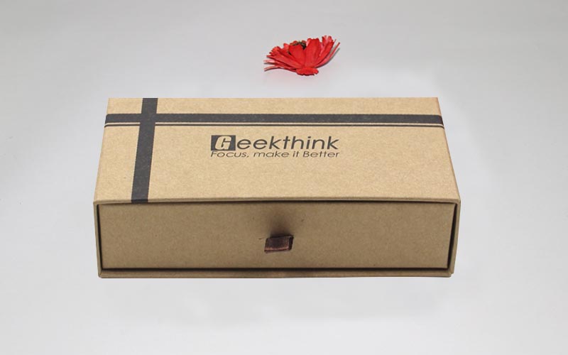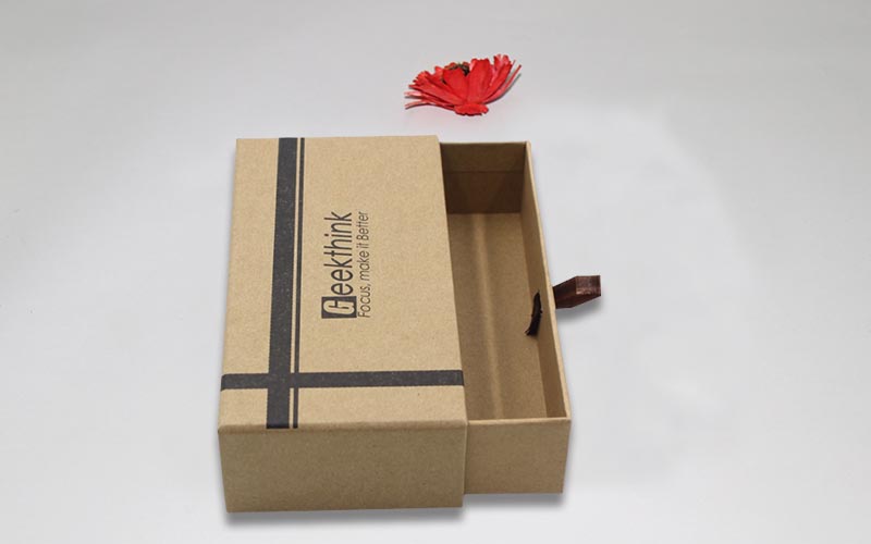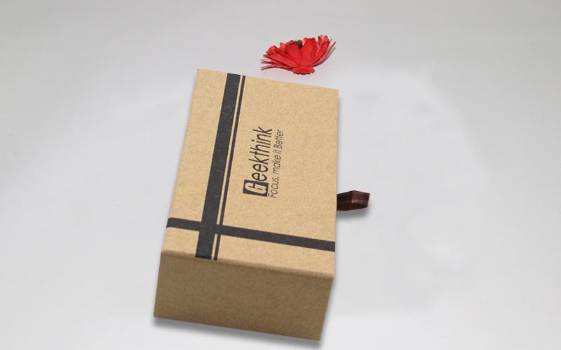 1.材質 :棕色牛皮紙單面單色印刷,裱1200G雙灰闆,内抽盒也用一樣的材質,粘一抽拉的絲帶,整款盒子材質工藝一樣機械化制作。