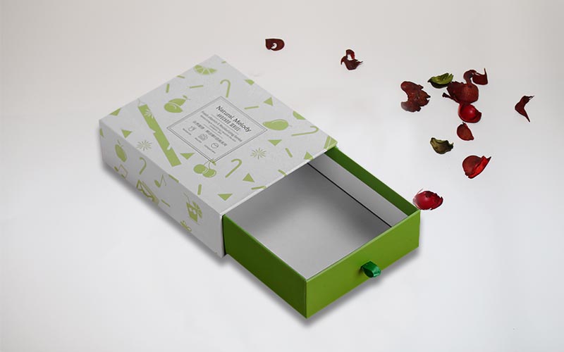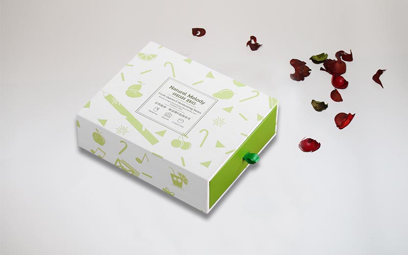 1.材質:盒子採用157G銅版紙彩色印刷單面啞膜 ,小圖片UV光油 ,裱1200G單白闆,盒子整體爲淺綠色,抽屜盒型粘綠色絲帶盒子,裏面内托爲白色A級材質無味道。
