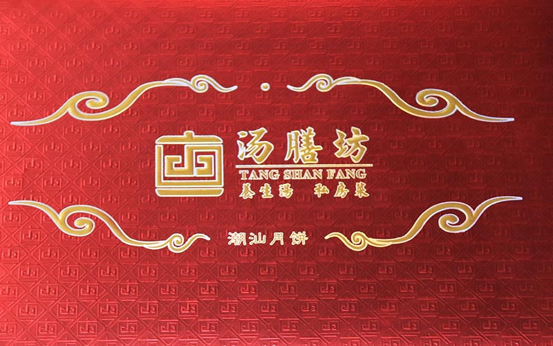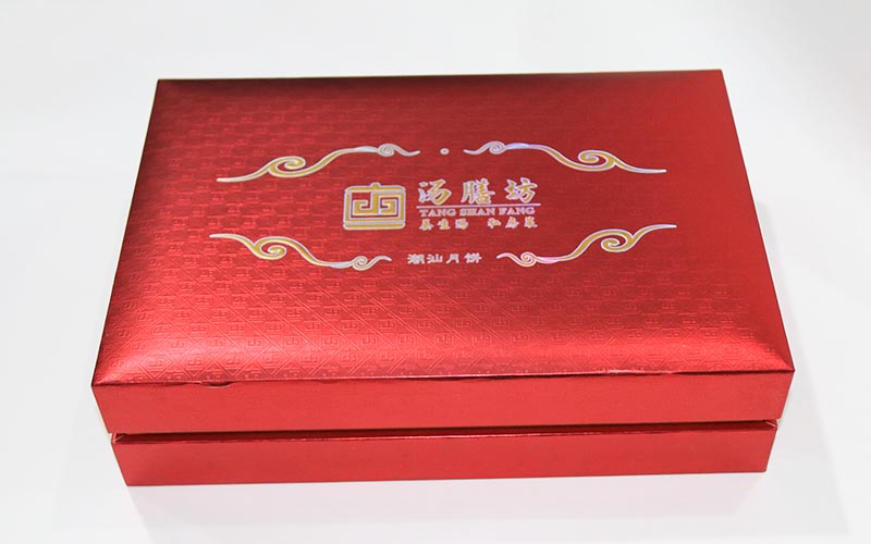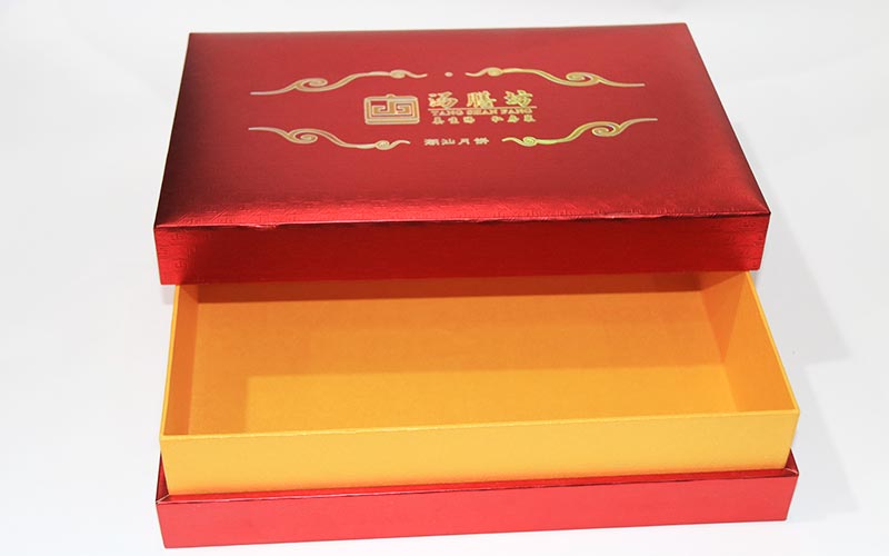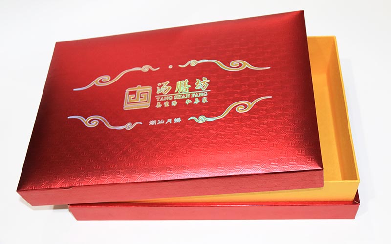 1.材質 :月餅包裝盒定制外盒材質用250G厚度紅色紋路特種紙,表面燙金燙銀激凸文字,上盒裱5MM的密度闆,加一層2MM的海綿,盒子内部結構用黃色萊利紋裱1800G光滑雙灰闆,下盒上盒一樣材質。盒型爲上下天地盒整款盒子都是手工制作。